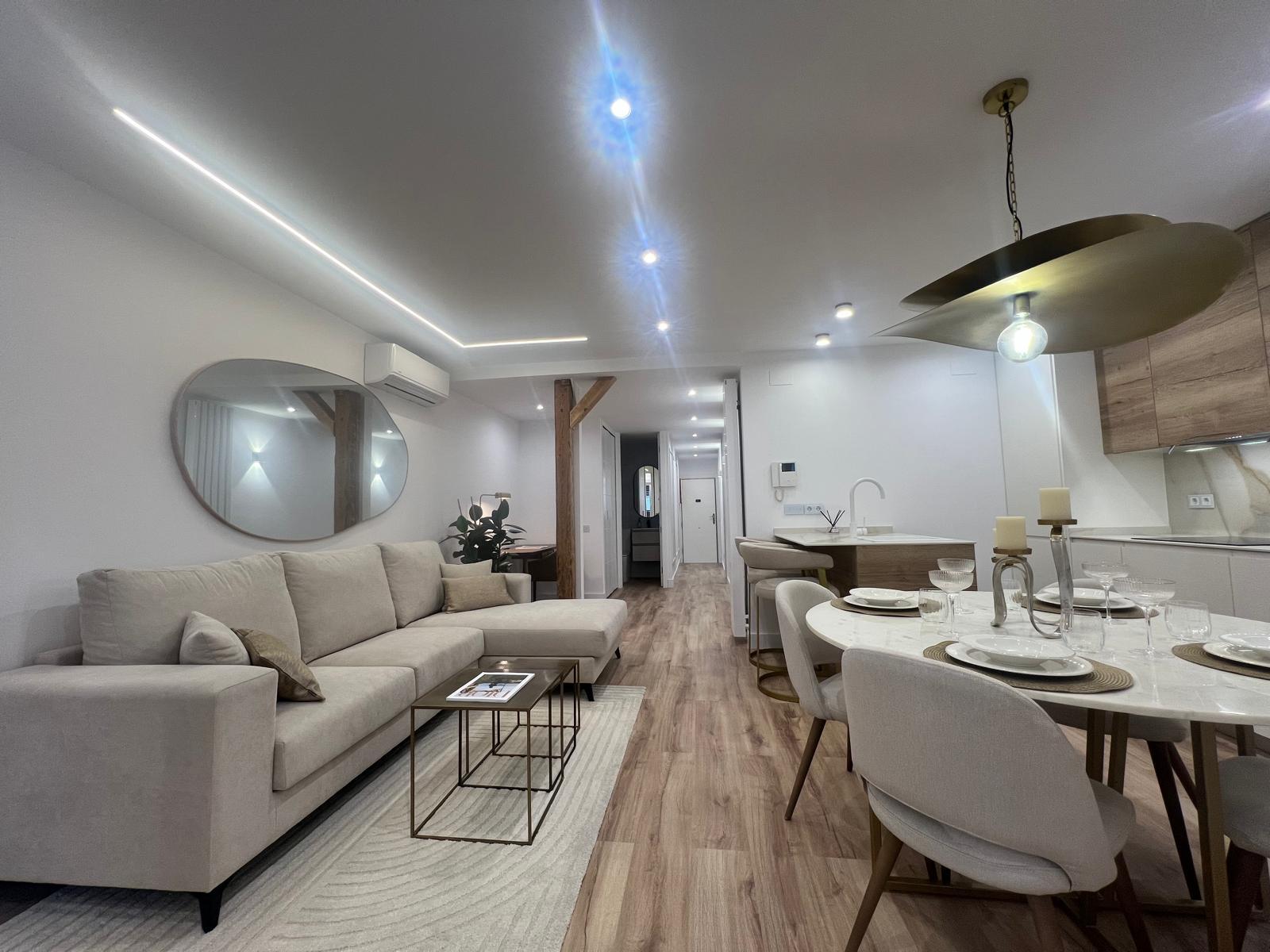 Zona Social: Un amplio salón-comedor con cocina abierta de diseño, equipada con electrodomésticos integrados de última generación (nevera, lavavajillas, horno micro/grill, vitrocerámica, lavasecadora y campana).